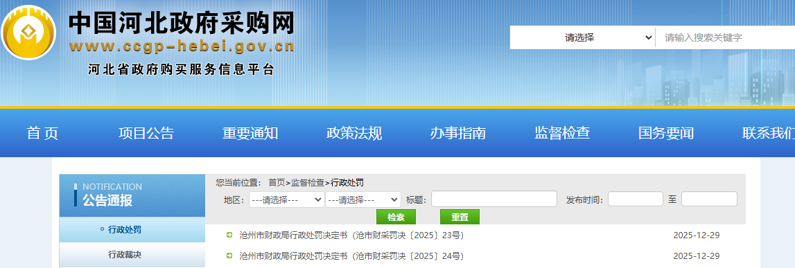 三家当事人分别收到沧州市财政局的处罚决定书,两家被处以警告,一家被处以罚款10884元人民币、列入黑名单并两年内禁参加政府采购活动。