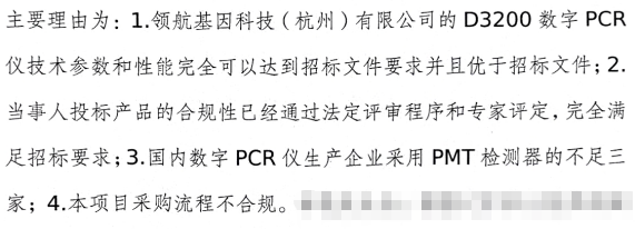 当事人在投标文件中提供的D3200数字PCR仪的生产商为领航基因科技(杭州)有限公司,并在技术规格偏离表中载明上述技术规格无偏离。