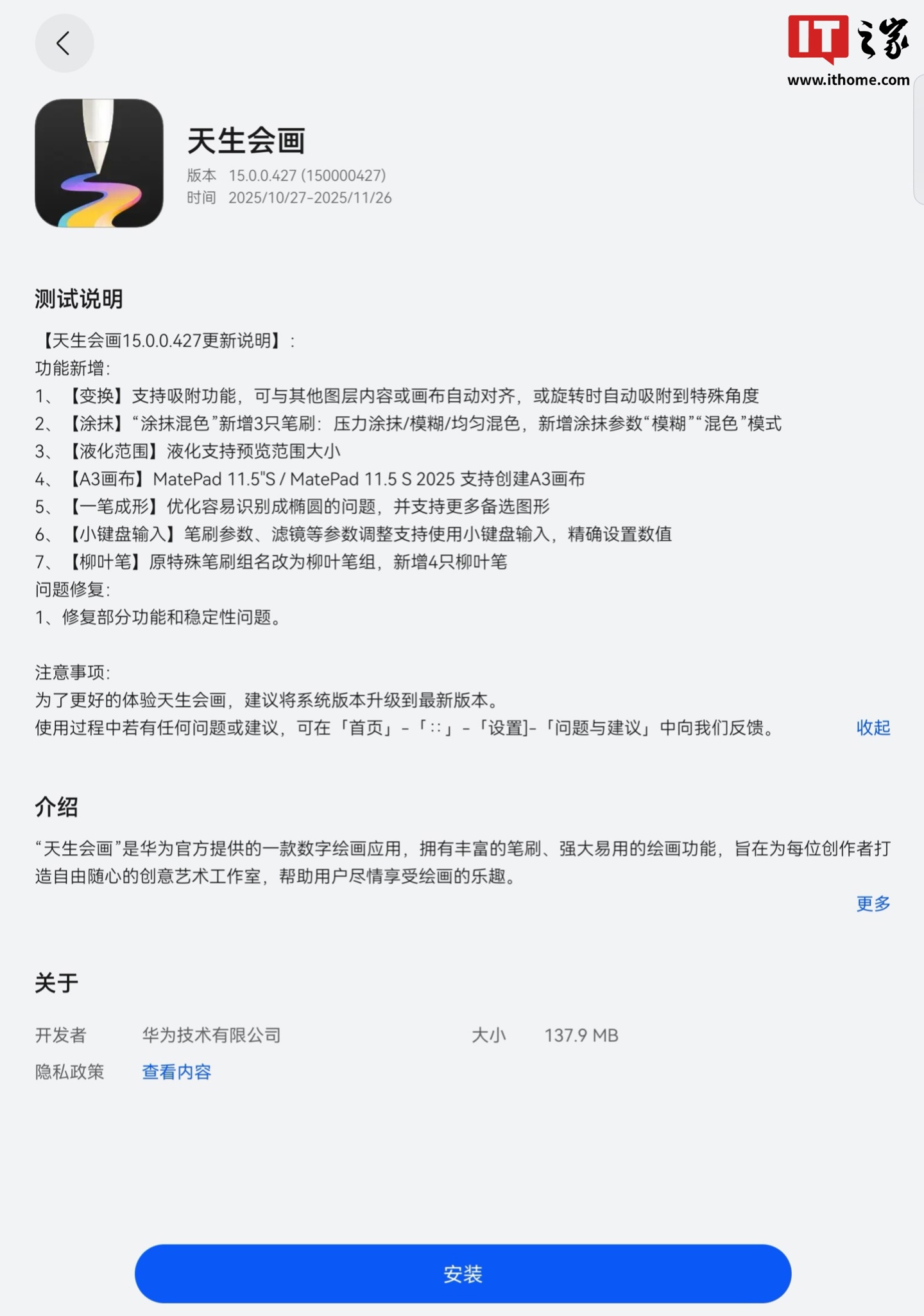 IT之家附华为天生会画 App 本次测试版本新特性如下: